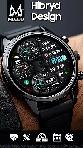 MD338 Hybrid watch face offers a sophisticated and customizable experience for Wear OS users. This advanced watch face supports devices with API Level 33+ and includes features like 4 preset app shortcuts, 1 customizable shortcut, and 4 customizable complications that display data such as weather, barometer readings, and more.