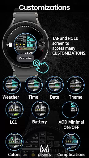 Customization is at the core of MD339, enabling users to touch and hold the screen, then tap 'customize' to personalize their watch face. Options include setting up complications that pull data from health metrics, world clock, barometer, and more. Note that some complications require additional apps which are managed externally. Daily weather forecast visibility may be limited during certain hours due to provider issues, but hourly forecasts remain accessible.