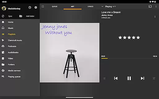 The app's standout feature is its ability to wirelessly synchronize your entire music library, including metadata like ratings and play history, with a Windows PC. Additionally, it allows users to stream or download content from UPnP/DLNA servers, making it versatile for home audio systems. Its folder browsing capability lets users navigate their library using the device's physical file structure, offering a more intuitive way to manage large collections.