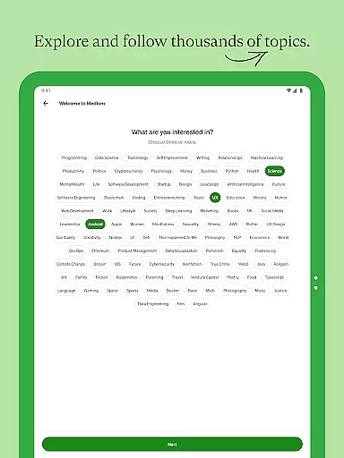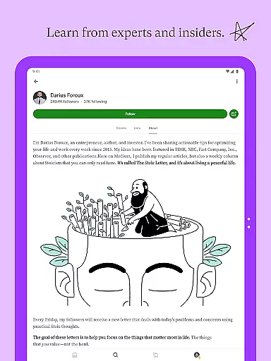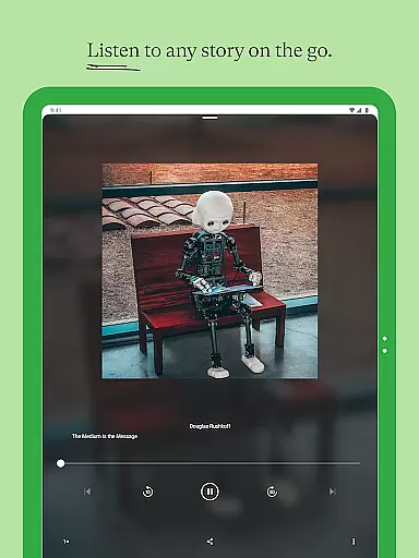 Additional standout features include the ability to follow favorite writers and publications, join thought-provoking discussions in the comments, and even listen to audio versions of articles. Writers can publish their own stories, grow their audience, and earn money through the Medium Partner Program. The app's minimal design prioritizes readability, offering light and dark modes for user comfort.