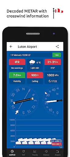 Metar-Taf stands out with its extensive feature set tailored for aviation weather tracking. The app's METAR visualization presents significant weather and cloud information using intuitive symbols similar to non-aviation weather reports. Its unique crosswind calculation combines METAR data with runway information, providing pilots with crucial takeoff and landing insights. The TAF section breaks down forecasts hour by hour, displaying them in clear tables alongside sunrise/sunset times and temperature variations.