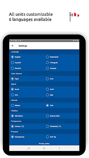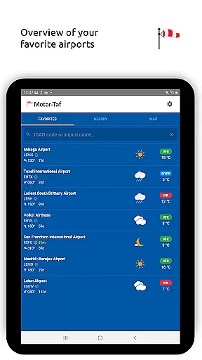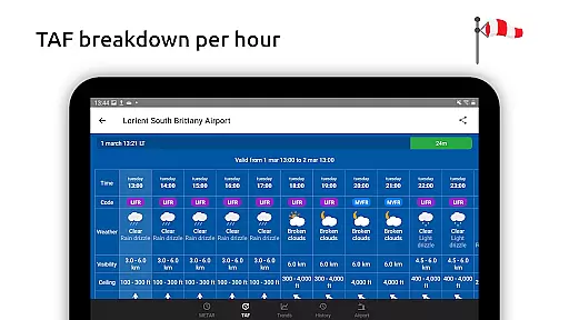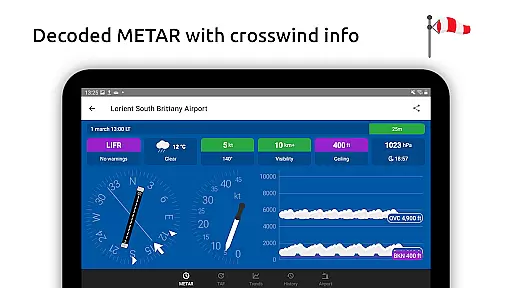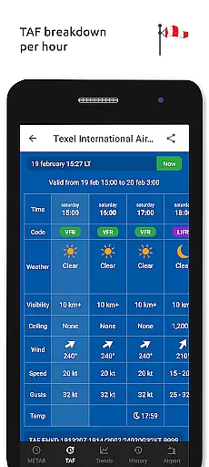 In addition to its robust METAR capabilities, Metar-Taf offers detailed TAF breakdowns displayed hourly in tables, complete with sunrise/sunset times and temperature extremes. Users can track their favorite stations, access observations near their location, and search airports by ICAO code or name. The app also includes historical weather trend graphs, customizable units for various measurements, and automatic data saving for offline use. Available in six languages, Metar-Taf is an essential tool for anyone needing accurate, real-time aviation weather information.