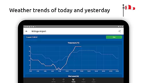 Pilots can view sunrise and sunset times alongside minimum and maximum temperature predictions, which aids in strategic flight preparations. The app also tracks weather trends through graphs showing changes in temperature, visibility, wind speed, and QNH over today and yesterday.