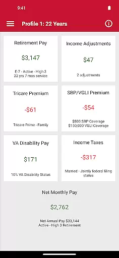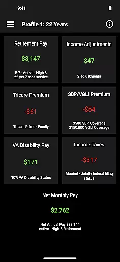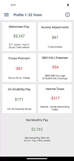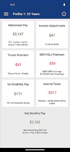 Military Retirement offers a robust set of features tailored specifically for military personnel. The app calculates retirement pay based on rank, years of service, and retirement date, accommodating even those with less than three years in rank. Additionally, it provides estimates for Survivor Benefit Plans, TRICARE medical insurance premiums, disability pay, and Veterans Group Life Insurance coverage.
