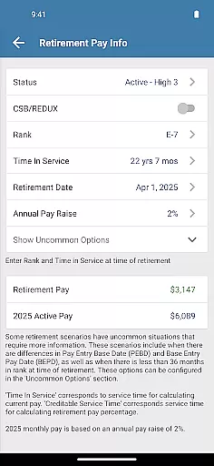 Users benefit from highly detailed algorithms that ensure precise calculations based on rank, years of service, and retirement date. The app supports multiple retirement plans including Final Pay, High-3, BRS, and CSB/REDUX, allowing comprehensive comparisons tailored to individual needs. Each calculation provides clear insights into potential retirement benefits.