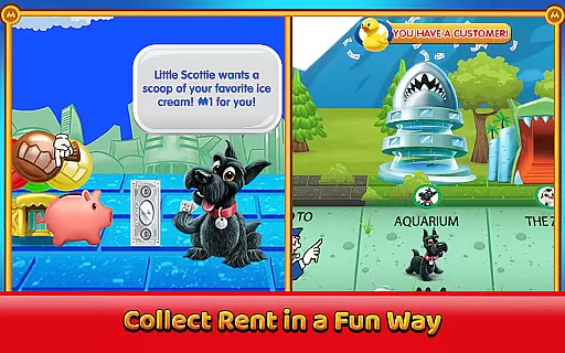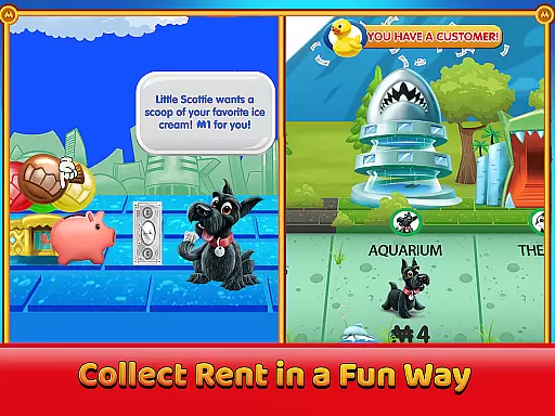 Monopoly Junior offers a range of features that make learning fun and interactive for children. The app includes 16 beautifully animated locations such as the Toy Shop, Bakery, and Aquarium, each providing unique customization opportunities. Kids can practice money handling by buying properties, collecting rent, and paying bills, which helps reinforce basic addition and subtraction skills.