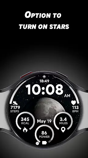 In addition to its core functionality, Moon Dial provides various customization options and practical features. Users can enable a star effect, choose between 12/24-hour formats, and toggle between kilometers and miles. The watch face also includes five customizable complications, enabling users to personalize their display with preferred data points.