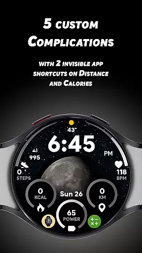 Customization is a key aspect of Moon Dial's design. Users can activate a starry background effect and choose from five different complications to display personalized information. Two invisible app shortcuts are cleverly integrated into the calories and distance indicators, allowing quick access to favorite apps without affecting their primary functionality. Practical features include tap-to-open options for battery and heart rate monitoring apps.