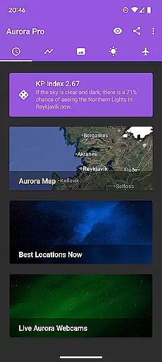 The app goes beyond basic forecasting by offering detailed solar wind statistics, high-resolution sun imagery, and live aurora webcams from around the world. Whether you're planning your next aurora viewing trip or simply want to stay updated on geomagnetic activity, My Aurora Forecast Pro delivers all the essential tools in an ad-free environment.