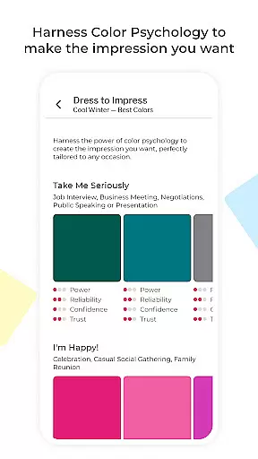 Moreover, the app offers Smart Wardrobe Tools such as Capsule Palettes and Dress to Impress options. Capsule Palettes enable users to mix and match colors harmoniously, creating versatile outfits from thousands of community-curated schemes. The Dress to Impress feature allows users to select colors based on their mood and goals, ensuring they always make the right impression in any situation. These personalized tools transform the way users approach fashion and self-expression.