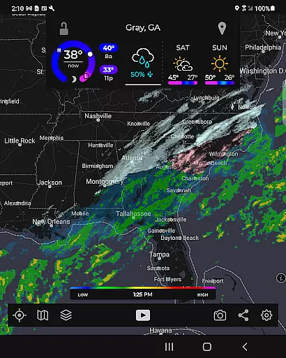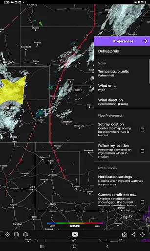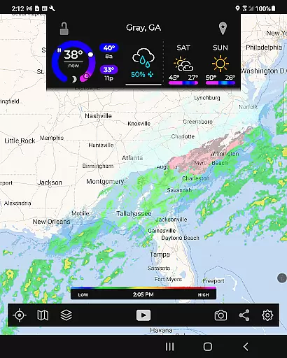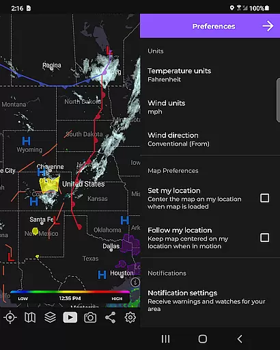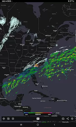 The app utilizes a custom mapping system optimized for device GPUs, resulting in fast and smooth map navigation. With standard pinch/zoom functionality, users can explore weather patterns across the globe seamlessly. For enthusiasts seeking more detailed analysis, a premium upgrade unlocks advanced features such as real-time hurricane tracking and professional radar packs, allowing selection of specific radar stations and tilt angles.