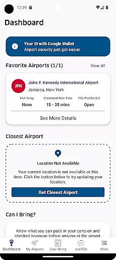 With MyTSA, users can search for allowed items through security checkpoints, request live assistance via AskTSA, check historical airport busyness, view crowd-sourced wait times, and add their own wait time data. Additionally, it provides delay information, weather conditions, preparation guides, and details on TSA PreCheck® availability.