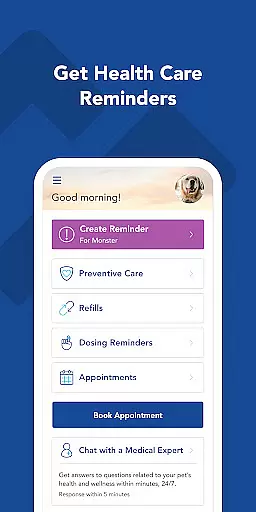 Another key feature is the ability to set up health care and medication reminders. Users can schedule notifications for vaccinations, medications, and other essential health-related tasks, helping them stay on top of their pet's wellness routine. Additionally, the quick appointment booking system allows users to easily schedule vet visits at their convenience.