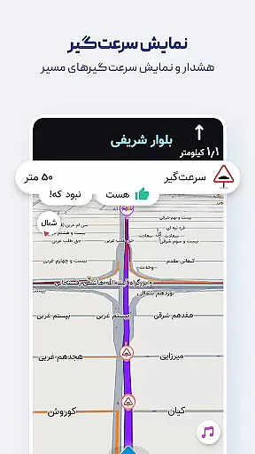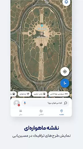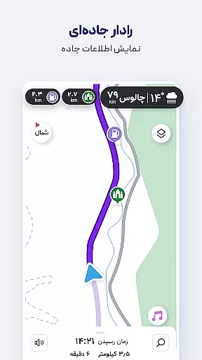 Another key feature is the Persian voice guidance system, which speaks street names aloud, allowing drivers to keep their eyes on the road. Users can also search for nearby public places like restaurants, gas stations, and hotels without typing, thanks to the app's Persian speech recognition technology. These robust features collectively enhance user experience by delivering both convenience and safety during travel.