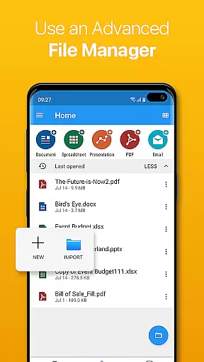 OfficeSuite Pro + PDF boasts an array of features designed to enhance productivity. It supports a wide range of file formats including DOC, DOCX, XLS, XLSX, PPT, PPTX, and PDF, ensuring seamless document handling. The app's desktop-style interface allows users to work with complex office documents effortlessly, providing full compatibility with Microsoft formats and additional support for Open Office formats through in-app purchases.