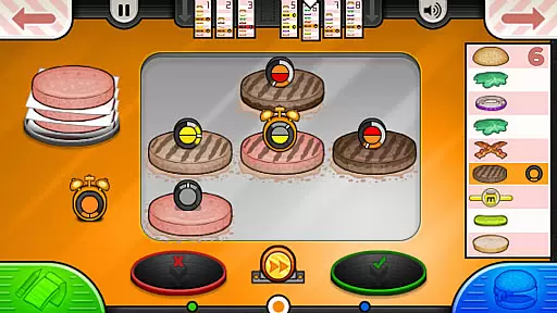 Papa's Burgeria To Go! stands out with its redesigned control system optimized for mobile devices. The thumb-friendly interface allows seamless switching between Order Tickets and different stations. The Grill Station features visible timers on each patty and optional alarms for perfect cooking. The Build Station introduces a unique carousel system for adding toppings, allowing precise stacking without finger obstruction.