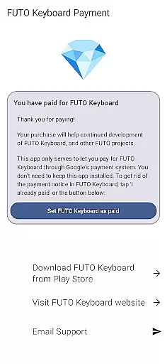 Payment for FUTO Keyboard is a specialized tool application designed to facilitate payment for the main FUTO Keyboard app. This app itself does not include any keyboard functionality but serves as a payment gateway for users who wish to support the development of FUTO Keyboard through Google Play.