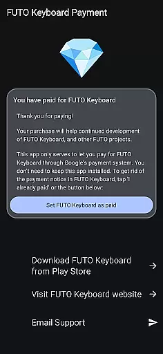 Another notable feature is the straightforward payment process it offers. Users can easily navigate through the app to complete their purchase without any hassle. Once the transaction is completed, the app automatically updates the main FUTO Keyboard to reflect the changes, enhancing the overall user experience by removing any payment-related interruptions.