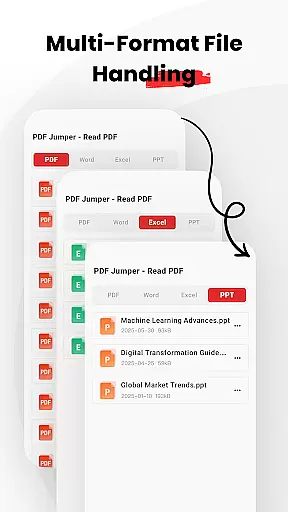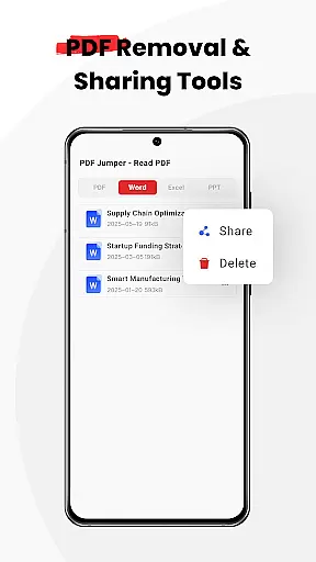 Beyond basic viewing, PDF Jumper supports multiple document formats including PDF, DOC, PPT, and Excel files. The app's smart sharing feature enables quick document transfer in various supported formats. Additionally, comprehensive file management capabilities allow users to organize, share, or delete documents directly within the application.