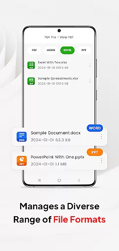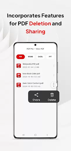 Beyond basic PDF viewing, the app supports multiple document formats including Doc, PPT, and Excel files. Users can organize, share, and delete various file types within the same application. The quick page navigation feature enhances reading efficiency, making it ideal for business professionals who need to review documents on-the-go. These capabilities make PDF Pro-View PDF an essential tool for modern workplace productivity.