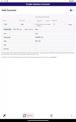 In addition to dosage calculations, the app provides a built-in converter that seamlessly switches between different measurement units. This includes converting micrograms (mcg) to milligrams (mg) and milliliters (mL) to microliters (uL). Such functionality ensures that researchers can work with various measurement systems without any hassle.