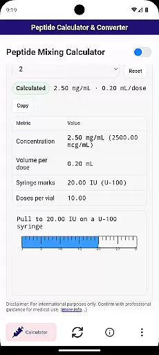 The app's core functionality lies in its ability to calculate peptide doses accurately. Whether you are measuring reconstitution values or determining the dosage per unit on an insulin syringe, this calculator ensures precision and reliability. Additionally, it includes a convenient converter that transforms mcg to mg and mL to uL, making it an all-in-one solution for research-related calculations.
