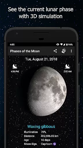 In addition to visual simulations, the app offers practical information such as moonrise and moonset times, distance from Earth, and phase names. Interactive elements let users drag the moon phase timeline back and forth or 'spin' it to jump ahead. With GPS detection, the app customizes views based on your hemisphere and location, providing a personalized experience. Social sharing capabilities round out the feature set, allowing users to share their favorite moon images across various platforms.