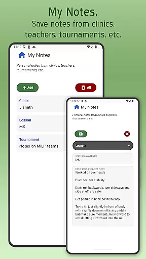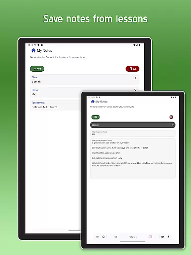 Furthermore, 'My Notes' provides a platform for capturing insights gained during lessons, clinics, or tournaments. Users can document personal observations, tips received, or strategic thoughts, which can be revisited later for reflection or adjustment of their learning strategies.