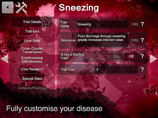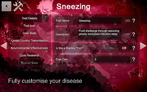 Plague Inc: Scenario Creator offers a comprehensive suite of tools for designing custom scenarios. The Core lab lets users define basic scenario information and write background narratives, while the Disease lab enables the creation of bespoke pathogens with tailored symptoms and transmission methods. In the World lab, users can adjust country-specific attributes such as population size, climate, and healthcare budgets, allowing for detailed world-building. The Government lab adds another layer of complexity by letting creators dictate how governments respond to outbreaks, modifying existing actions or inventing new ones.