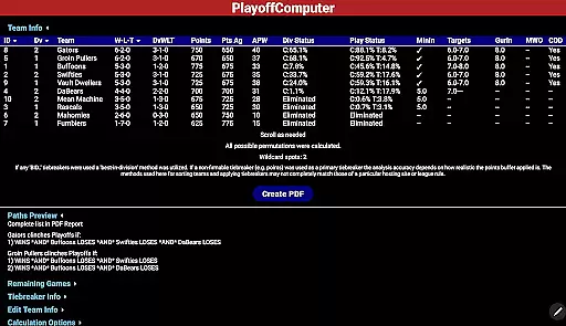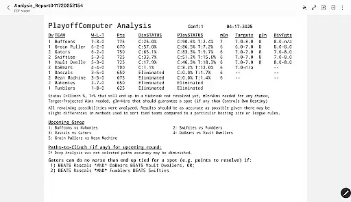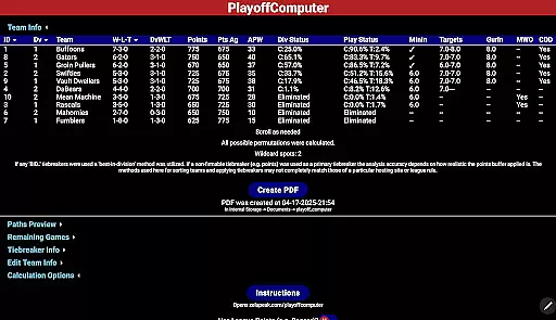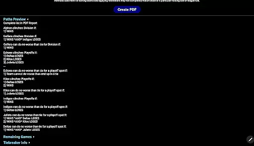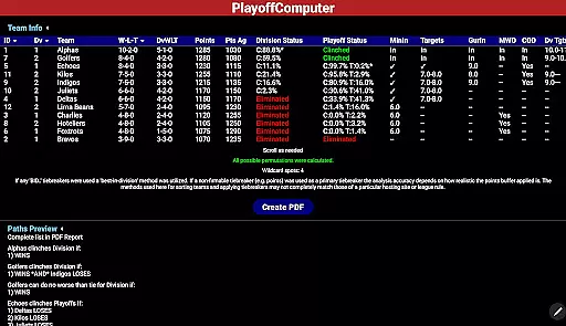 The application operates on two access levels: Basic and Premium. The Basic version offers approximate odds for teams to win titles or make playoffs, while the Premium subscription unlocks advanced features such as Paths-to-clinch reports, PDF outputs, and definitive clinched/eliminated statuses. This makes PlayoffComputer an essential tool for serious league participants who want to gain deeper insights into their team's performance and strategic possibilities.