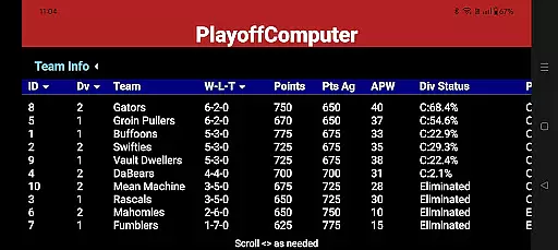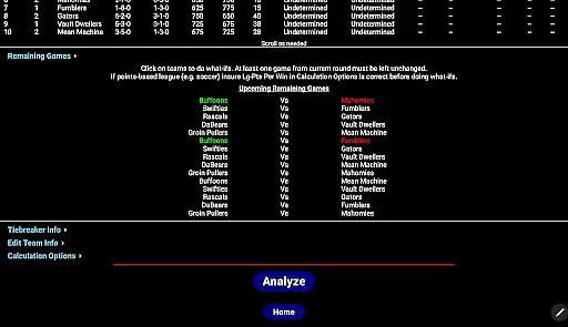 Premium users benefit from advanced tools like Median scoring calculations, NFL-style Paths-to-clinch listings, and detailed team projections. These features provide actionable insights, helping users understand what their teams need to achieve specific goals. The app's robust handling of complex league requirements ensures accurate analysis, although it demands significant device resources due to its intricate computational processes.