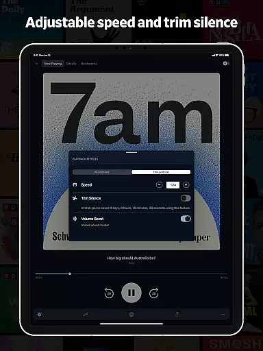 Pocket Casts offers advanced playback options such as variable speed control from 0.5x to 5x, silence trimming to optimize listening time, and volume boosting for clearer audio. These features ensure users get the most out of every episode without unnecessary distractions.