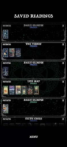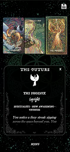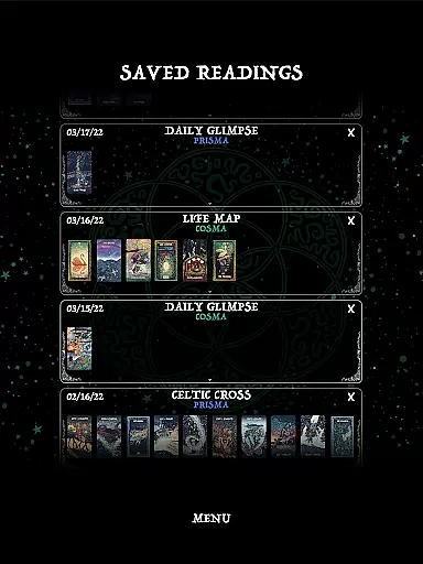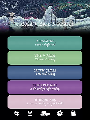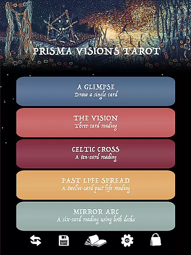 This wide selection ensures that users can choose a spread that best suits their inquiry or situation, providing varied perspectives and insights. The inclusion of both Prisma Visions Tarot and Cosma Visions Oracle decks further enriches the experience by offering distinct artistic interpretations and meanings.
