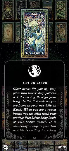 In addition to the extensive card options, the app provides several reading formats including single card, three-card, Celtic Cross ten-card, Past Life Spread twelve-card, Mirror Arc six-card, and Life Map six-card readings. These varied spreads cater to different types of inquiries and personal growth journeys. The inclusion of a log for saved readings allows users to maintain a history of their spiritual exploration, adding depth and continuity to their practice.
