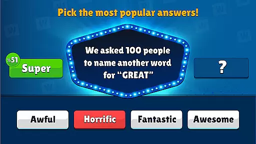 The core feature of Popular Words is its fill-in-the-blank question format, where players must guess the most common answers to everyday questions. With hundreds of unique questions and thousands of word challenges, the game provides an extensive vocabulary workout while maintaining an enjoyable experience through its simple design and autocorrect system.