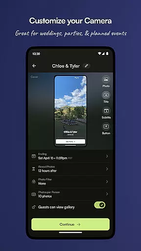 The app provides a highly customizable camera interface where event hosts can set precise parameters for each guest's photo allowance. This includes determining the exact number of photos each participant can take, which helps in managing the flow of content generated during the event.