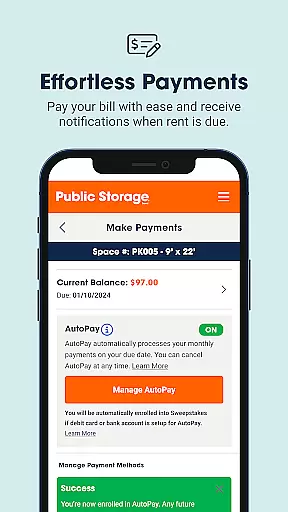 The app's standout feature is its ability to grant users seamless access to gates, doors, and elevators at most locations through their smartphones. This eliminates the need for physical keypads and streamlines the process of visiting your storage unit. Additionally, the app offers functionalities like one-tap bill payments and AutoPay activation, ensuring timely payments and avoiding late fees. Users can also manage multiple accounts and units in one place, update preferences, and reach out to customer support when needed.
