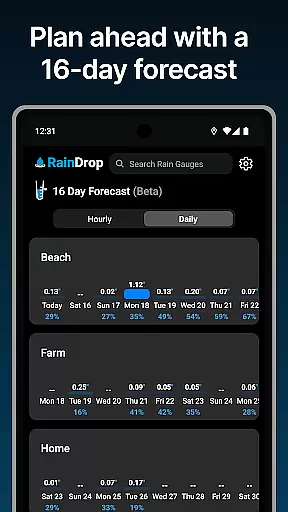 RainDrop's forecasting system is designed to deliver real-time rainfall amounts as well as historical data. This allows users to view past daily and hourly rainfall totals, which is crucial for professionals in agriculture, construction, and environmental monitoring. The inclusion of a 16-day rainfall forecast further enhances its utility, offering an extended outlook that is both dependable and actionable.