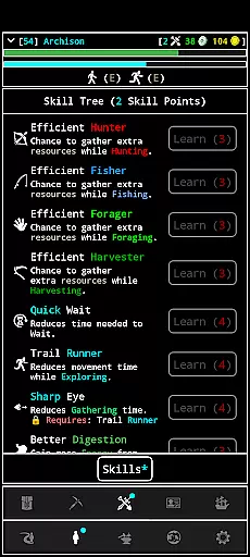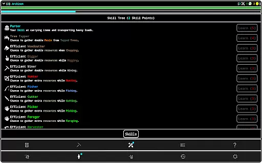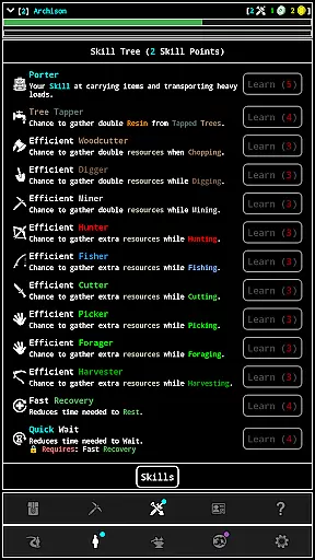 Leveling up grants Skill Points which can be invested in learning new Skills or enhancing existing ones. Whether it's mastering gathering skills like Woodcutter or Miner, each choice directly impacts how efficiently you can interact with the environment and how quickly you progress.