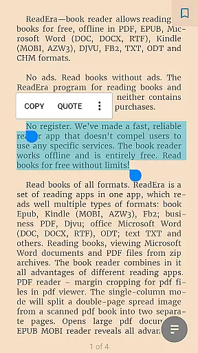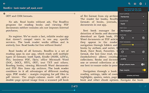 With ReadEra, users benefit from advanced features tailored for different formats. For instance, the app provides margin cropping for PDFs, single-column modes for scanned books, and footnote display at the bottom of pages, enhancing readability across various document types.