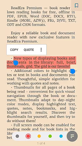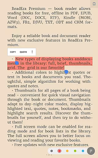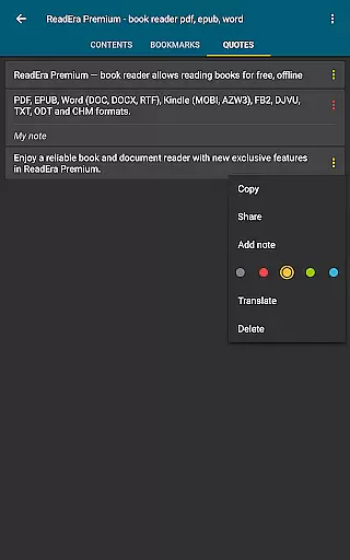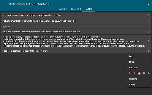 The app's premium features enhance the reading experience through advanced functionalities such as text-to-speech (TTS) for background listening, even with the screen locked. Users can also enjoy a centralized section for organizing quotes, notes, and bookmarks from all their books. Additionally, ReadEra Premium offers customization options like personalized fonts, library view settings, and color themes for highlighting text. These features make it an ideal tool for avid readers who want a seamless and enriched reading experience.
