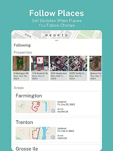 For power users, the Pro subscription ($10/month) offers enhanced functionality including automated property tracking through the Follow feature, which notifies users of changes to their selected properties. Additional premium features include measurement tools for calculating acreage and square footage, overlay options for owner names and parcel IDs, and specialized data fields covering land use, building footprints, and vacancy indicators.