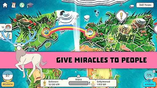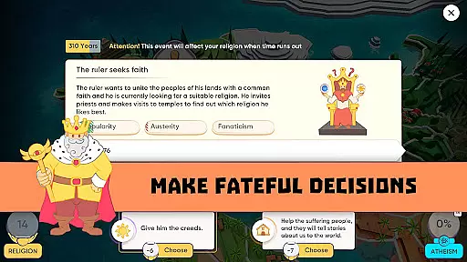 The game also includes powerful active abilities that allow players to perform miracles, directly influencing their followers and the world around them. Coupled with the unfolding story events, every playthrough feels fresh and exciting. Additionally, the title supports offline play, ensuring that your divine journey isn't interrupted by connectivity issues.