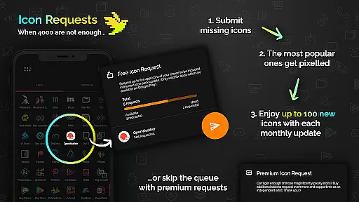 Compatibility is broad, supporting over 20 different launchers such as Nova, Action, ADW, and more. Monthly updates ensure fresh content regularly. Moreover, users benefit from five free icon requests per month, allowing personalized additions drawn by the artist herself.