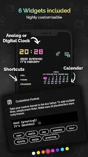 This icon pack stands out with its comprehensive set of features tailored for customization. Users can enjoy an expansive selection of 4050+ pixel-perfect icons, each crafted on a tiny 20x20 canvas then upscaled for sharpness. Additionally, it offers 12 vibrant wallpapers and 6 versatile widgets including digital and analog clocks, date displays, greetings, calendar views, and text shortcuts.