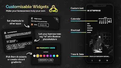 In addition to the extensive icon library, the pack includes 12 unique wallpapers and six versatile widgets. These widgets are not just functional but also customizable in terms of color and text, allowing users to create a home screen that is truly their own. The ability to mix and match widget colors or apply gradients adds another layer of personal expression.