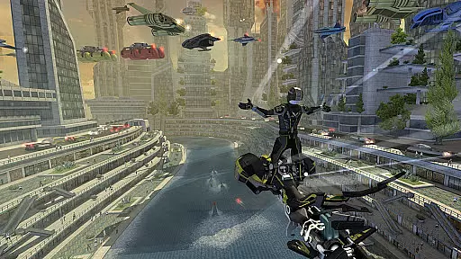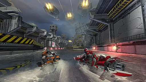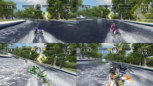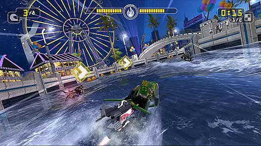 Online multiplayer functionality supports thrilling 8-player matchups against racers worldwide, while split-screen multiplayer enables local championships with up to 4 players on a single machine. The challenge mode lets players compete for leaderboard supremacy using ghost recordings of friends' performances. Additionally, transforming vehicles offer a garage of fast hydro jets that can be upgraded and customized, ensuring a unique racing experience every time.