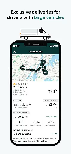 For drivers with larger vehicles, RoadieXD™ presents additional opportunities through single-stop warehouse pickups and scheduled blocks, offering a more structured routine. These features collectively contribute to a comprehensive and adaptable delivery service that meets diverse driver needs.