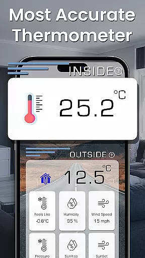 Room Temperature Thermometer is a comprehensive weather monitoring app that transforms your smartphone into an advanced digital thermometer. The app provides accurate indoor and outdoor temperature readings, functioning as both a thermostat and hygrometer. It utilizes your phone's thermal sensors while also connecting to hyper-local weather stations for precise measurements.
