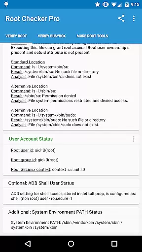 The app's effectiveness lies in its comprehensive analysis of various root-related parameters. It examines standard su binary locations, file permissions, root uid/gid settings, and SELinux contexts, providing users with a detailed overview of their device's root status.